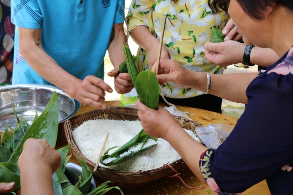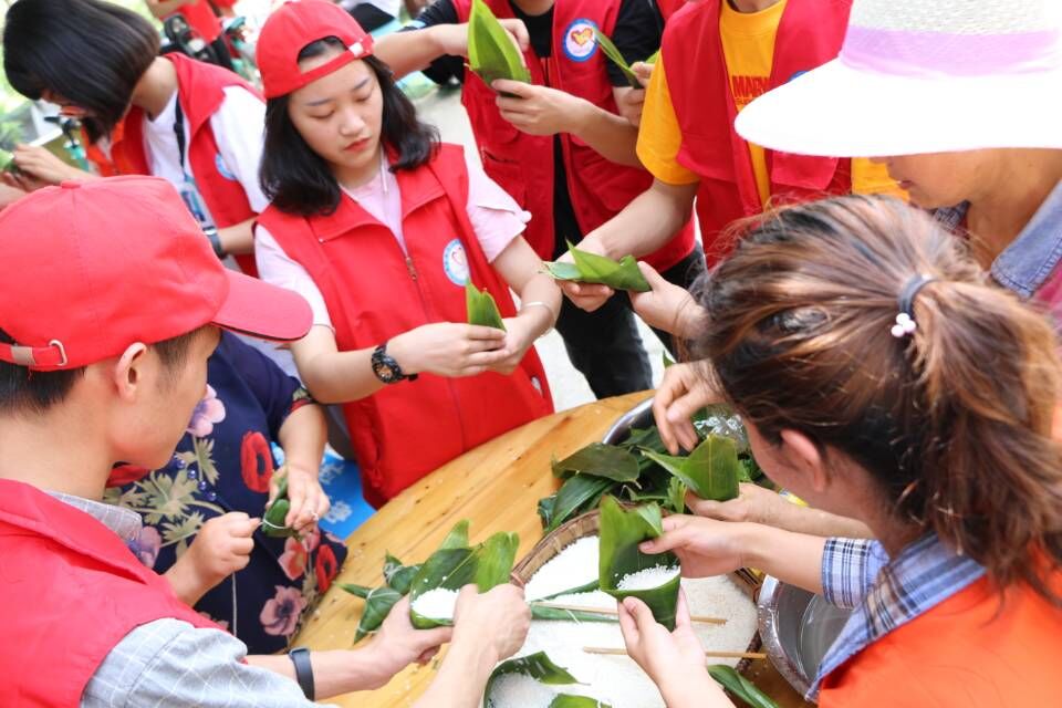 在活动现场,公司青年志愿者为当地村民带来自编自导的文艺节目、趣味游戏、端午知识竞赛等娱乐活动,阵阵欢声笑语成为疲惫与辛劳田间劳作的别样符号。当地村民面对来访的公司青年志愿者倍感亲切,主动向他们介绍风土人情,讲述当地的端午故事,展示独特的端午风俗。志愿者们边听边记,对当地民俗文化传统发出阵阵赞叹。在田间地头,公司志愿者组织了一场包粽子比赛,正所谓“彩缕碧筠粽,香粳白玉团。”卷筒、压米、扎绳……,当地村民无论是速度还是外观都技高一筹。反观90后志愿者们的粽子,大小不一、绳散漏米。经过热心的村民一遍又一遍耐心指导,一个个美观匀整的粽子热腾出锅,现场一片其乐融融的景象。