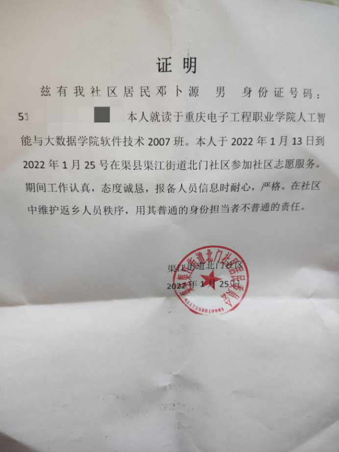 2022年的寒假,当得知渠县渠江街道北门社区还需要志愿者的时候,本应寒假在家休息的英国365上市公司软件2007班邓卜源同学,积极响应号召,投身于社区服务当中去了。