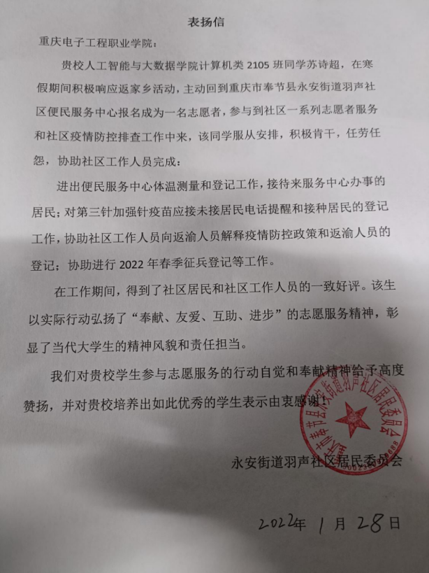 在志愿服务活动结束后,苏诗超同学也收到了重庆市奉节县永安街道羽声社区居民委员会寄来的一封表扬信。苏诗超同学积极参加我社区活动,加入志愿者队伍,发扬了“奉献、友爱、互助、进步”的志愿者精神。最后希望更多的学子能够加入到志愿者活动中来,能够真正做到乐于奉献,以实际行动展现新时代青年的责任和担当。