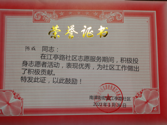 在为期十二天的志愿活动中,陈成同学做了许多有意义的事情,在这段旅程中他融入社区这个大家庭,与其他志愿者一起不断进步、不断成长。从最开始打电话通知社区居民接种加强针,以及登记外地返乡人员,帮助他们进行疫情报备,到后来帮助社区工作者填写信息,设计表格。处理这些事务提高了陈成的处事能力,并将他所学的专业知识运用到了生活之中,在让他内心产生一种成就感的同时感受到了社区工作者要肩负的责任与使命。