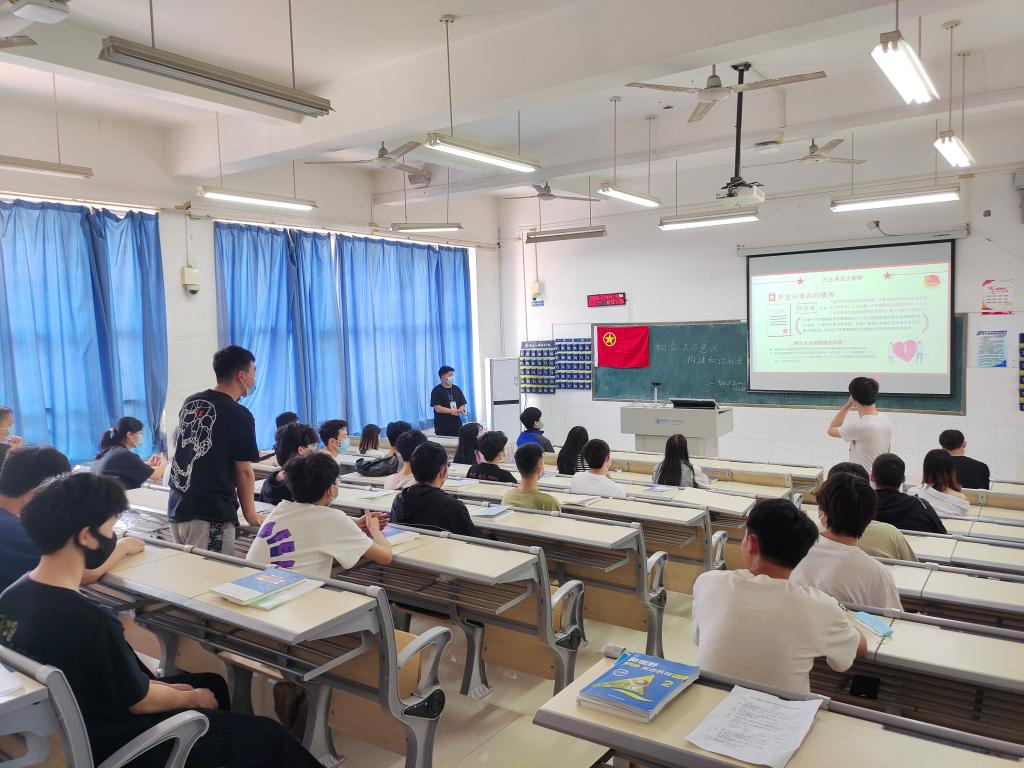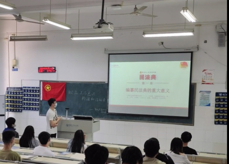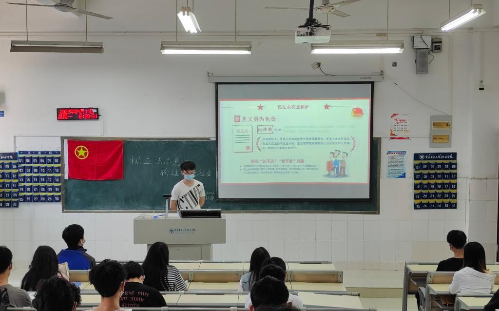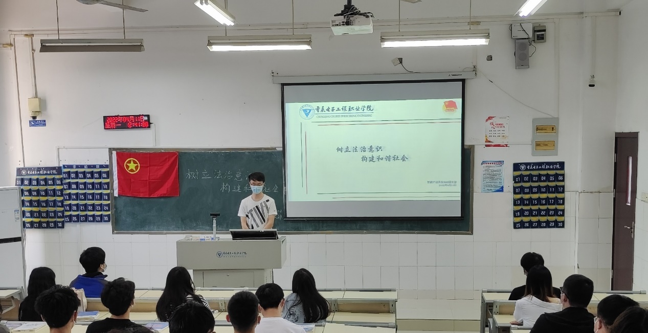 此次主题团日活动在嘹亮的《光荣啊,中国共青团》歌声中拉开序幕,智能产品开发2002团支部书记杨洪围绕守法用法,养成守法习惯等内容和同学们进行学习分享。