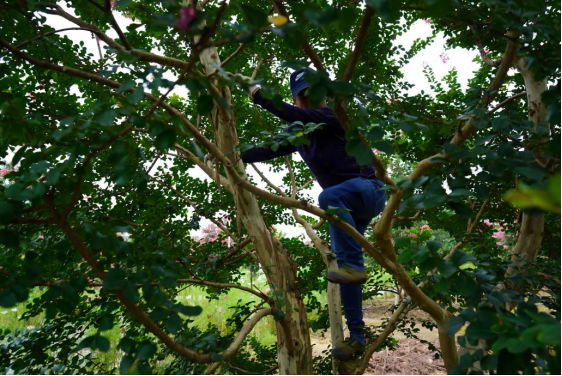 图为苗圃场中工作人员正在修剪树枝 周彬摄