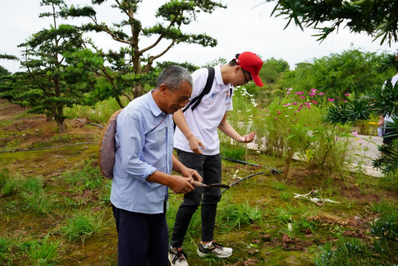 图为实践团成员向在苗圃场工作的老年人学习如何除杂草 周彬摄