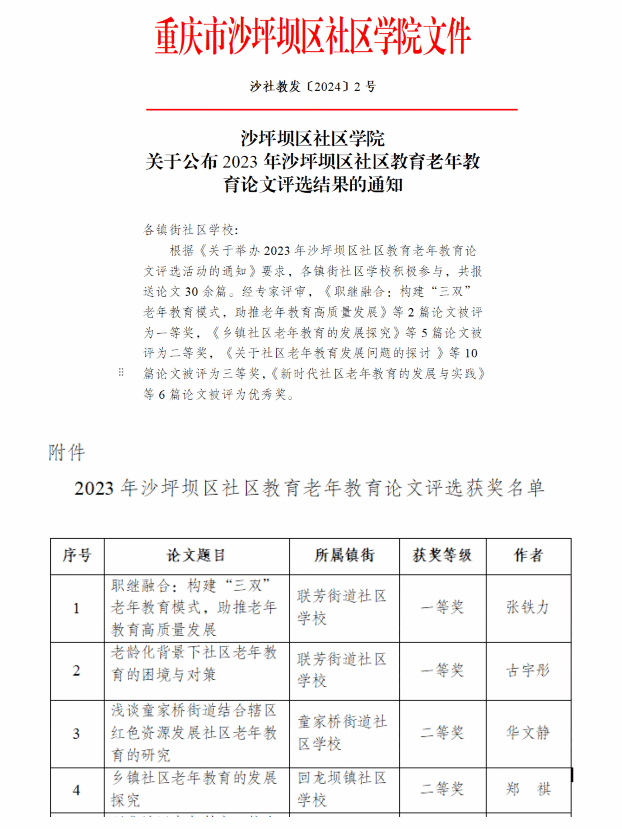 近日,重庆市沙坪坝区社区公司公布了2023年沙坪坝区社区教育老年教育论文评选结果,由公司英国365上市公司和沙坪坝区联芳街道共建的重庆邻安老年科技大学选送的《职继融合:构建“三双”老年教育模式,助推老年教育高质量发展》和《老龄化背景下社区老年教育的困境与对策》分别荣获一等奖。