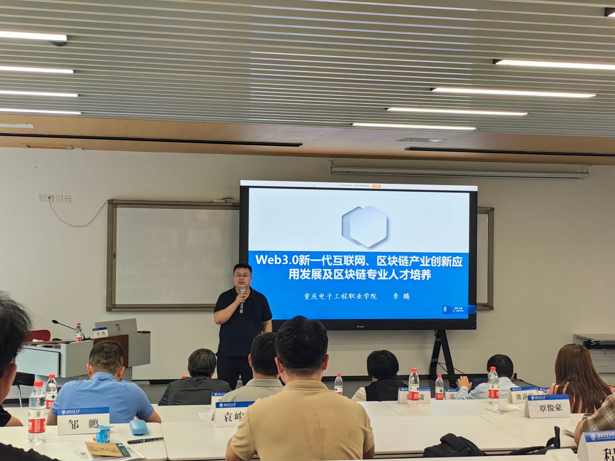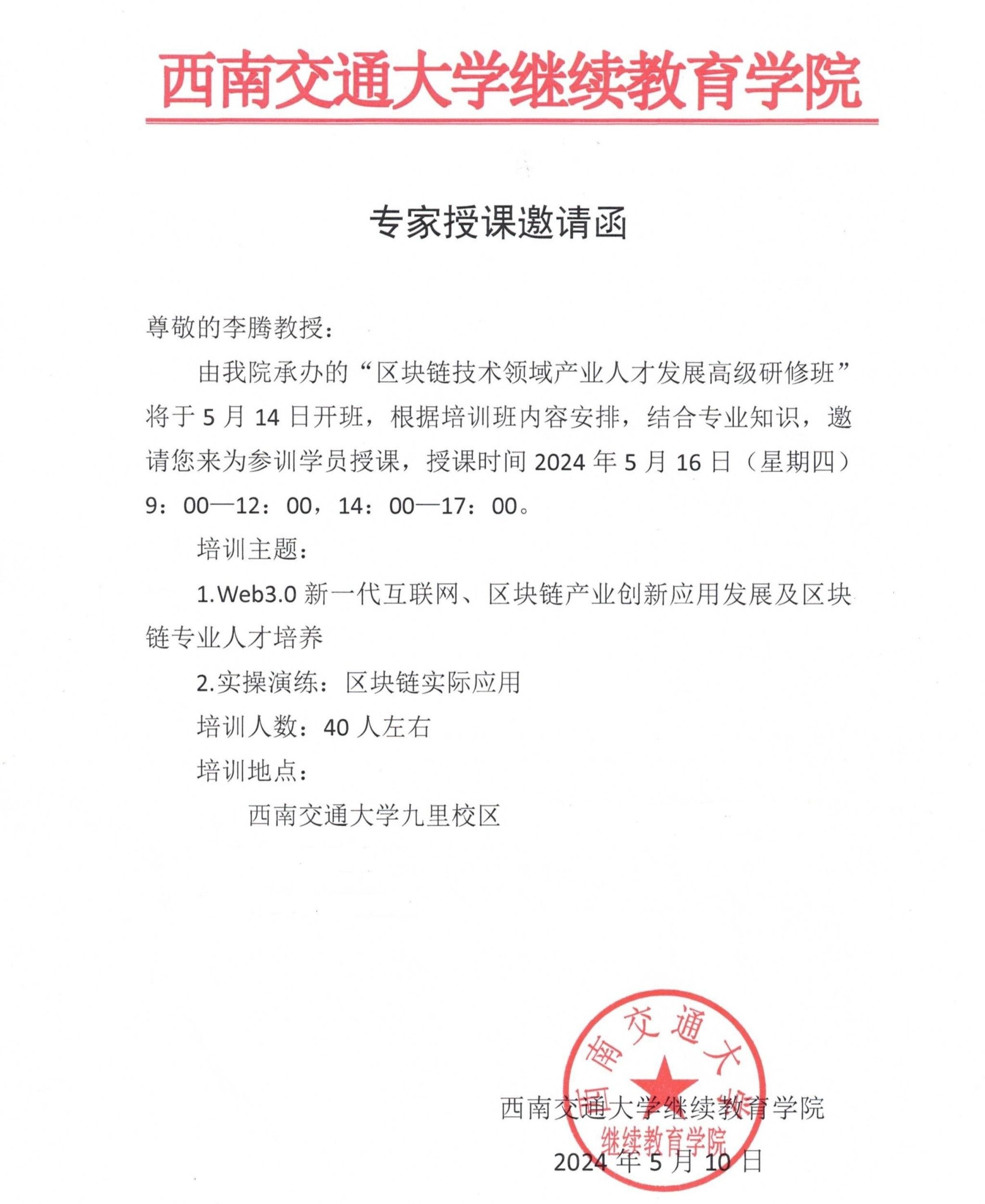 经人力资源和社会保障部批准、由四川省人力资源和社会保障厅主办、西南交通大学承办的“区块链技术领域产业人才发展高级研修班”在西南交通大学九里校区举行。5月16日,公司区块链技术应用专业带头人李腾教授受邀为研修班学员授课。
