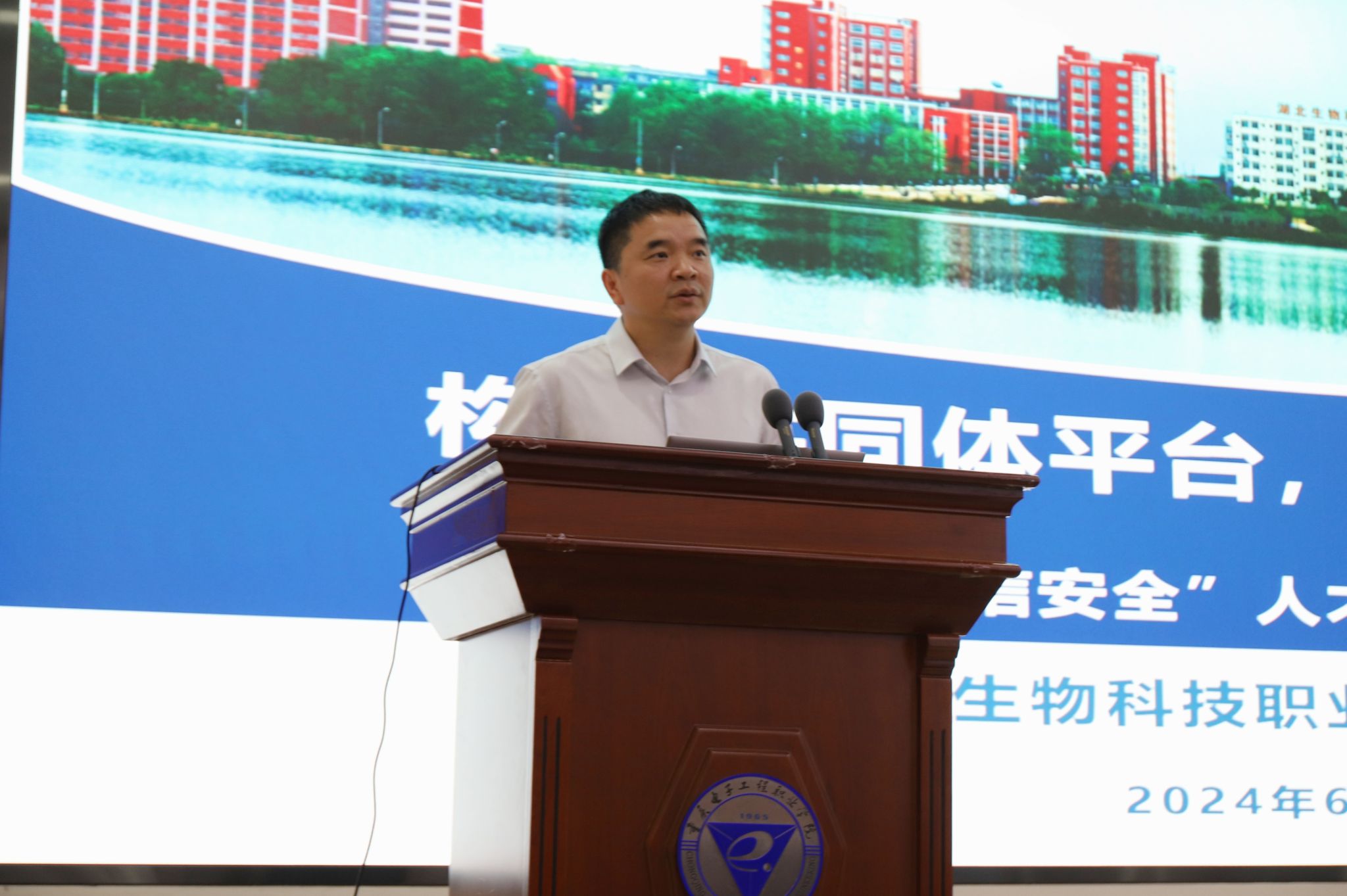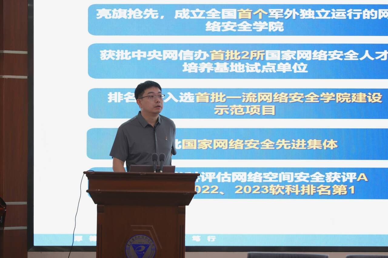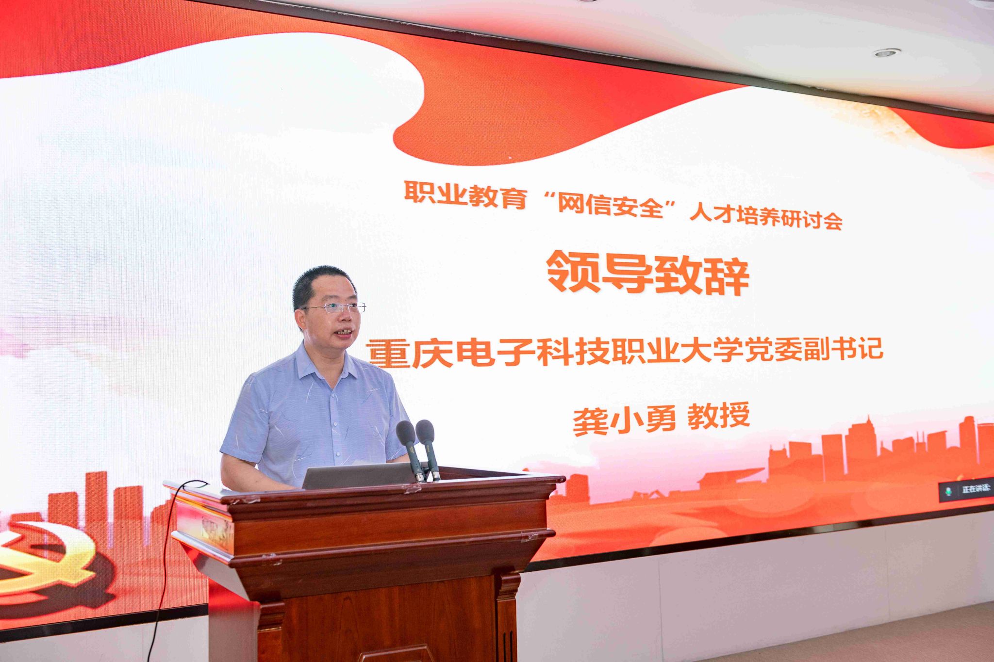 龚小勇副书记代表公司致辞。他提出,党的十八大以来,以习近平同志为核心的党中央高度重视网信人才培养工作,提出了一系列新思想、新观点、新论断,为新时代网信安全人才培养和建设提供了根本遵循。公司深入学习领会、全面贯彻落实,注重发挥“电子信息”办学特色优势,深耕网信安全人才培养,积极服务成渝地区双城经济圈建设,推进实施国家教育数字化战略行动,助力数字中国建设。近年来,公司以“可信计算”为特色,打造信息安全技术应用国家级高水平专业群,建立了多个技术研发与创新平台,并与多家机构和企业合作,取得了显著成绩。作为重庆市第一所公办本科层次职业公司,公司将继续深化合作,培养高质量的网信安全人才,推动数字经济产业发展,并全面推进本科层次职业公司建设,为现代职业教育体系构建和高质量发展贡献力量。