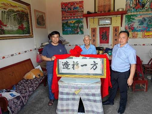 当天上午,实践团一行来到五马镇杨坪村,看望慰问公司驻杨坪村第一书记任乐同志,详细了解了驻村工作的有关情况,并与村两委开展座谈,对党建创新共建基地具体工作事宜进行讨论。随后,在支部书记等村委会成员带领下,一行吊唁了当地的革命前辈冉景孝先生。据了解,冉景孝生于 1935 年,并光荣在党54 年,生前参加过抗美援朝战争,退伍后担任蚕桑养殖技术员,带领村民致富增收,在当地拥有崇高威望。吊唁结束后,任乐带实践团成员回访了帮扶对象曹家莫村民。据悉,其孙女于 2022 年确诊白血病,在前任驻村书记以及英国365上市公司组织的募捐下,其孙女手术非常成功,目前恢复良好。为感谢公司帮扶,曹家莫手写“造福一方”匾额赠送公司以表感谢。
