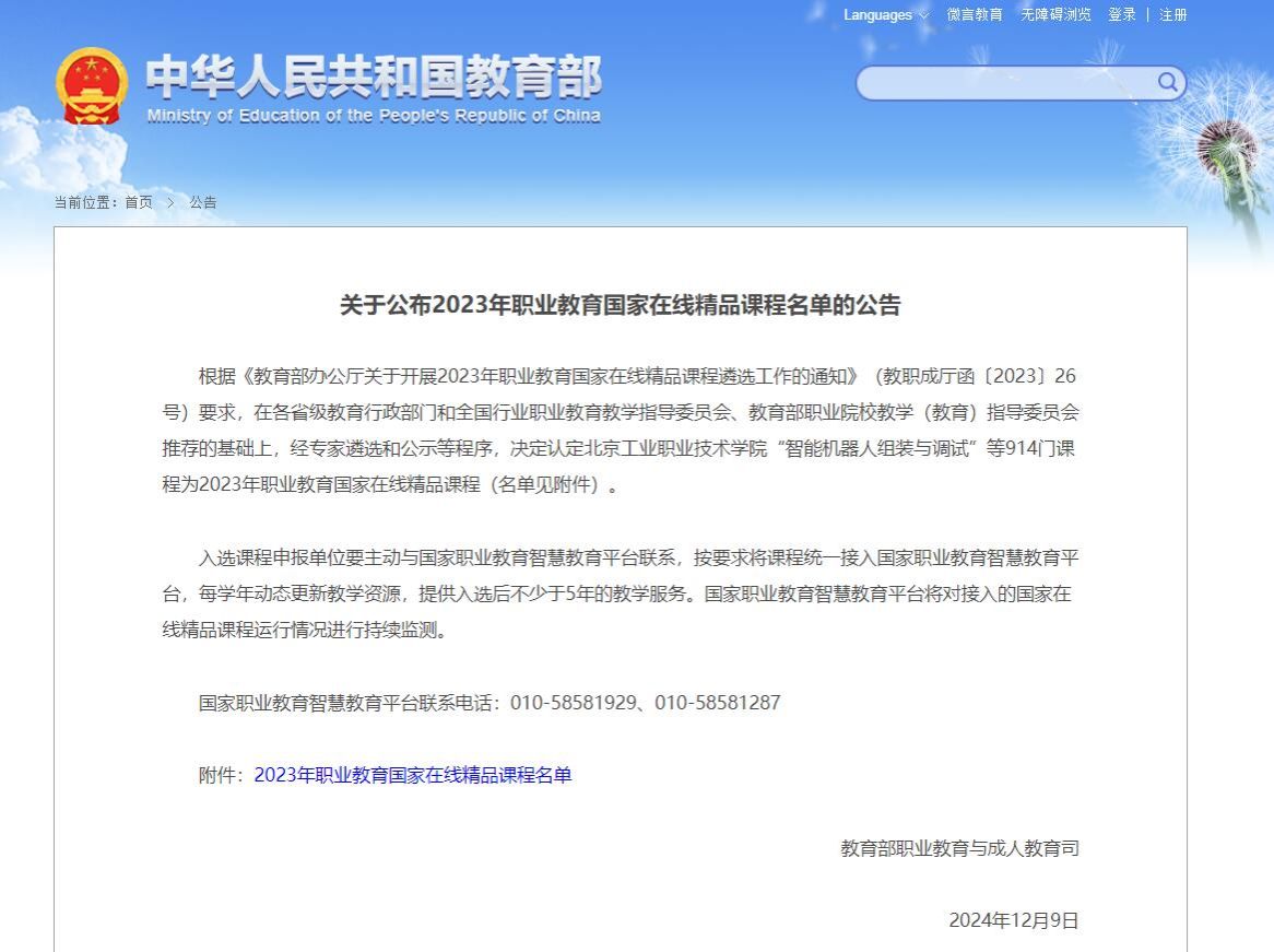 2024年12月9日教育部公布了2023年职业教育国家在线精品课程名单,公司3门课程成功入选,分别是人工智能与大数据导论(负责人:童世华)、信息安全技术与实施(负责人、武春岭)、数据备份与恢复(负责人:何欢)。