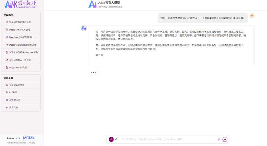 在“区块链+AI”、“云计算+AI”的融合应用展示环节中,展示了团队为南开中学打造的“爱·南开”AI教育大模型,重点演示了教学评价、员工助学、老师助教等方面的AI应用。