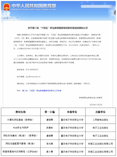 2025年11月3日,教育部职业教育与成人教育司对第二批“十四五”职业教育国家规划教材遴选结果进行了公示,拟确定2966本教材为第二批“十四五”职业教育国家规划教材,公司5部教材入选。
