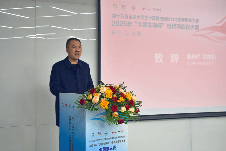 11月15日,大赛开幕式隆重举行。国家职业教育指导咨询委员会委员高林教授、全国高等院校计算机基础教育研究会鲍洁教授、北京久其软件股份有限公司芦星经理、公司党总支副书记张铁力等嘉宾出席。张铁力副书记在欢迎词中表示,承办此次大赛是深化产教融合、推动教学改革的重要契机,公司全力打造了专业的竞技环境。鲍洁教授与芦星经理先后致辞,充分肯定了重电的赛事组织能力与育人成效。最后,高林教授宣布大赛开幕。