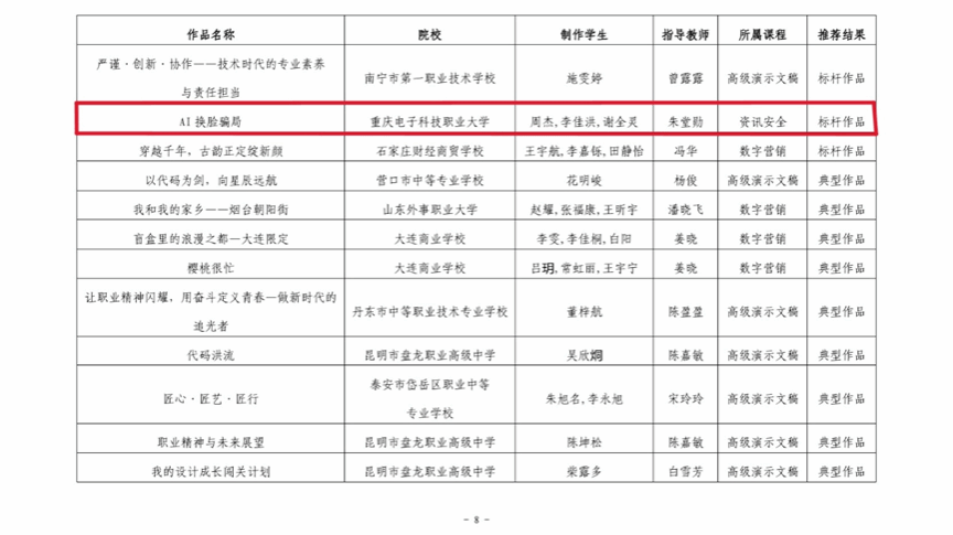 此次参评的3件作品均由千贝软件工匠工坊朱堂勋老师全程指导,紧紧围绕“资讯安全”专业核心课程体系,精准对接数字经济发展背景下企业对网络安全技能的实际需求。其中,《网络无界,安全有界》以行业真实应用场景为依托,深度融合网络边界安全核心技术规范与实际运维经验,形成了可复制、可推广的实践方案;《AI换脸骗局》聚焦当下高发的新型数字诈骗风险,系统完成了技术原理解析、骗局识别要点及针对性防范方案的设计,实用性极强,两件作品凭借扎实的专业性和突出的实用性获评“标杆作品”;《网络迷局》则创新采用场景化案例演绎模式,将抽象的网络安全知识转化为通俗易懂的内容,有效提升安全知识科普效果,获评“典型作品”。