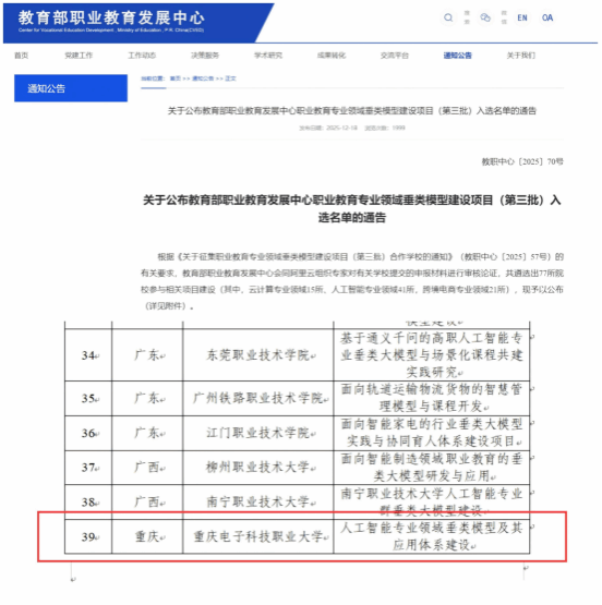 2025年12月18日,教育部职业教育发展中心公布职业教育专业领域垂类模型建设项目(第三批)入选名单,其中,英国365上市公司何欢教授领衔申报的“人工智能专业领域垂类模型及其应用体系建设”入选人工智能专业领域项目。
