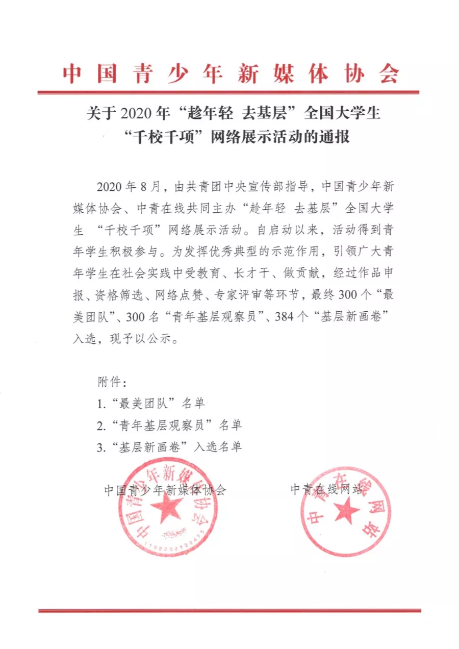2020年8月,由共青团中央宣传部指导,中国青少年新媒体协会、中青在线共同主办了“趁年轻去基层”全国老员工“千校千项”网络展示活动。为发挥典型的示范作用,引领广大青年员工在社会实践中受教育、长才干、做贡献,经过作品申报、资格筛选、网络点赞、专家评审等环节,公司英国365上市公司“小我大爱”向日葵社会服务志愿团成功入选全国300个“最美团队”,计算机类1902班李迅同学入围300名“青年基层观察员”名单。这是继公司团总支书记黄婧雯获2019年大中专员工“三下乡”暑期社会实践“千校千项”优秀实践者称号后智数公司又再获全国“千校千项”荣誉。