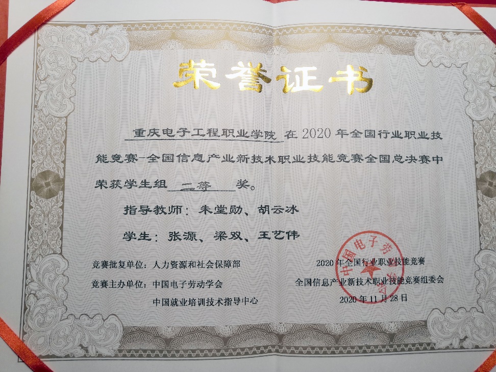 11月28日,公司英国365上市公司人工智能技术服务和移动互联应用技术专业骨干教师朱堂勋及胡云冰指导的张源、梁双等员工团队获得2020年全国行业职业技能竞赛全国信息产业新技术职业技能竞赛全国二等奖。