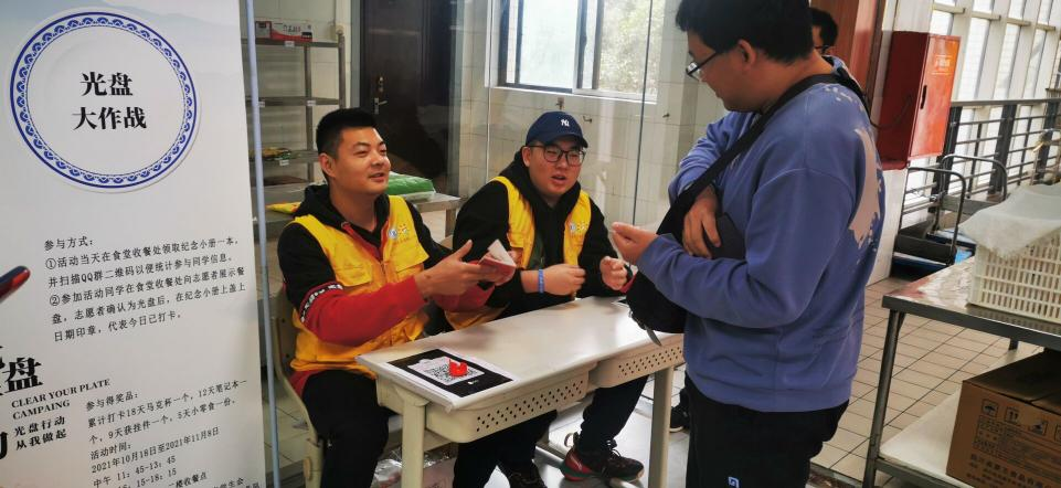 活动开始,刘泽宁同志、陈磊同志等早早换好志愿者的服装,并做好了分工,两位同志是打卡的,确认同学光盘后,将会在本子上盖章,其余同志是规范队伍的,要求做到归还碗筷的队伍井然有序,检查同学盘子里的饭菜是否吃干净,并对该活动进行宣传。前来打卡的同学络绎不绝。