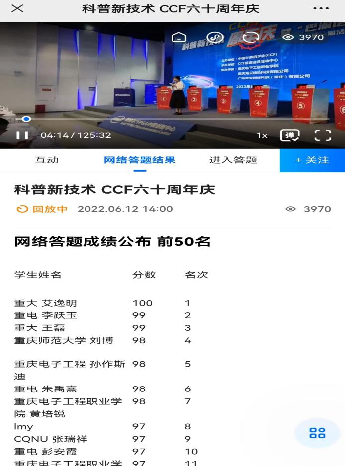 会上,结合CCF60周年庆祝主题,会议专门针对CCF60年发展历程,开发了300多道CCF相关文化常识赛题,通过线上和线下两种方式同时展开。在会议现场,来自重庆大学代表队、重庆邮电大学代表队、重庆师范大学代表队、重庆电子工程职业公司代表队、重庆工程职业公司代表队和重庆理工大学代表队的12名选手,经过“谁与争锋”“抢占先机”“一站到底”三轮激烈角逐,最终重庆大学代表队获得本次有奖竞答环节的一等奖,斩获奖金(人民币)1000元;重庆电子工程职业公司代表队和重庆师范大学代表队分别获得二等奖,奖金(人民币)800元;重庆工程职业公司代表队、重庆理工大学代表队、重庆邮电大学代表队分别获得三等奖,奖金(人民币)500元。场外会员通过现场直播方式参与了线上知识有奖竞答活动,按照答题成绩排名,前50名场外会员获得主办方提供的蓝牙音箱和U盘等实用的小礼品。