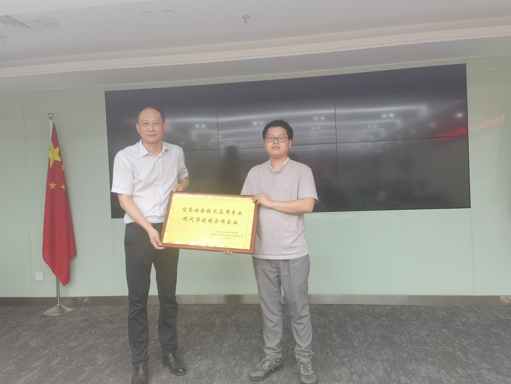 重庆市信息通信咨询设计院有限公司网络与信息安全研究分院胡敏经理对公司一行表示欢迎,并向公司师生介绍了网安分院的业务范围,以及等保测评、风险评估、安全运维、咨询设计、渗透测试等各个工作岗位需要具备的职业能力,希望各位参训同学既要注重公司理论知识的学习,也要注重职业技能的提升。张书记对信通院提供假期员工岗位实习,与公司共同落实开展现代学徒制项目表示感谢,并为公司授牌“信息安全技术应用专业现代学徒制合作企业”。
