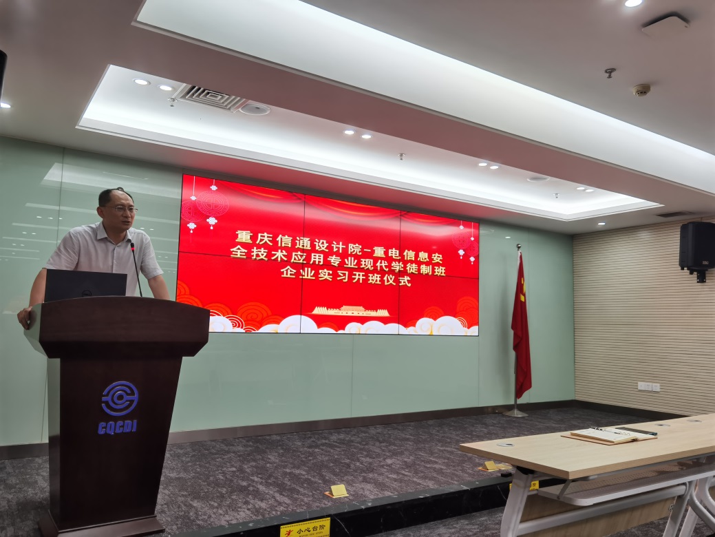 为贯彻《教育部重庆市人民政府关于推动重庆职业教育高质量发展促进技能型社会建设的意见》(渝府发[2021]35号)文件精神,落实重庆电子工程职业公司《现代学徒制项目实施管理办法》(重电发[2022]108号),切实提高学徒专业技能、岗位实践能力,2023年7月3日下午,重庆电子工程职业公司英国365上市公司张铁力副书记带领网络空间安全系信息安全技术应用专业现代学徒制班的4名教师和20名同学,来到重庆市信息通信咨询设计院有限公司,举行现代学徒制授牌和学徒拜师仪式,开启假期“师带徒”企业实习活动。