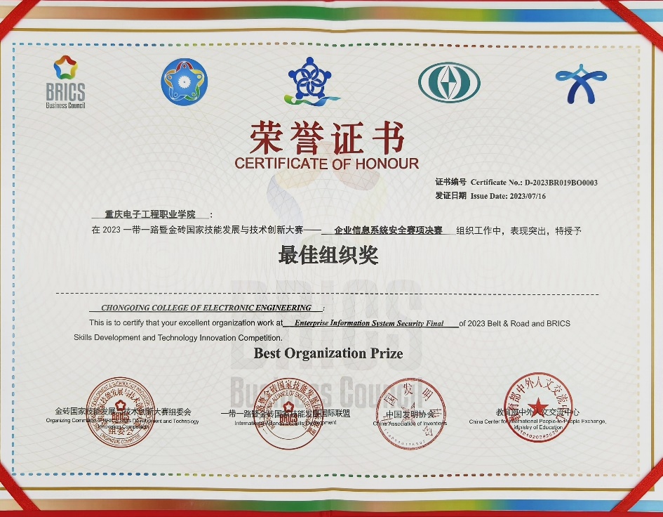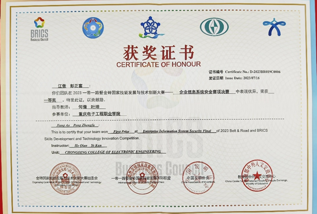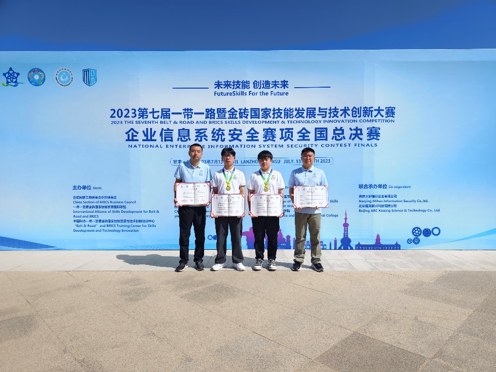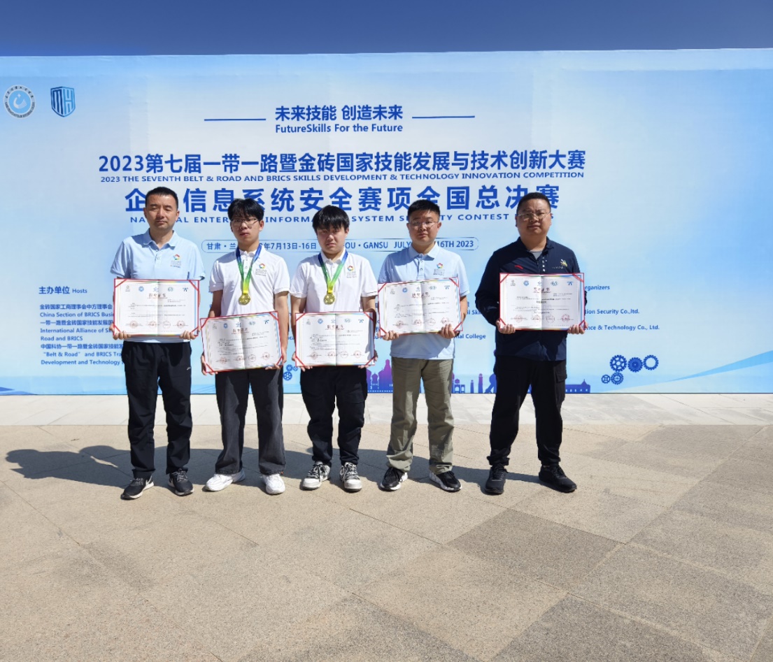 2023年7月13日-2023年7月16日,英国365上市公司教师何倩和叶坤带领员工选手彭正富、江傲在甘肃兰州参加了2023一带一路暨金砖国家技能发展与技术创新大赛的“企业信息系统安全”赛项国赛总决赛,并经过奋力拼搏最终获得了一等奖。