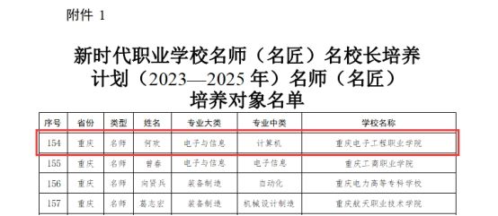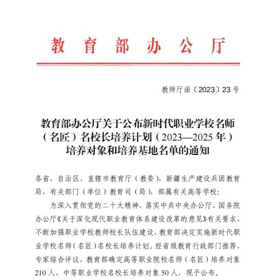 近日,教育部办公厅下发《关于公布新时代职业公司名师(名匠)名董事长培养计划(2023—2025年)培养对象和培养基地名单的通知》(教师厅函〔2023〕23 号),确定高等职业院校名师(名匠)培养对象210人、中等职业公司名董事长培养对象50人。公司何欢教授入选为高等职业院校名师培养计划名师。