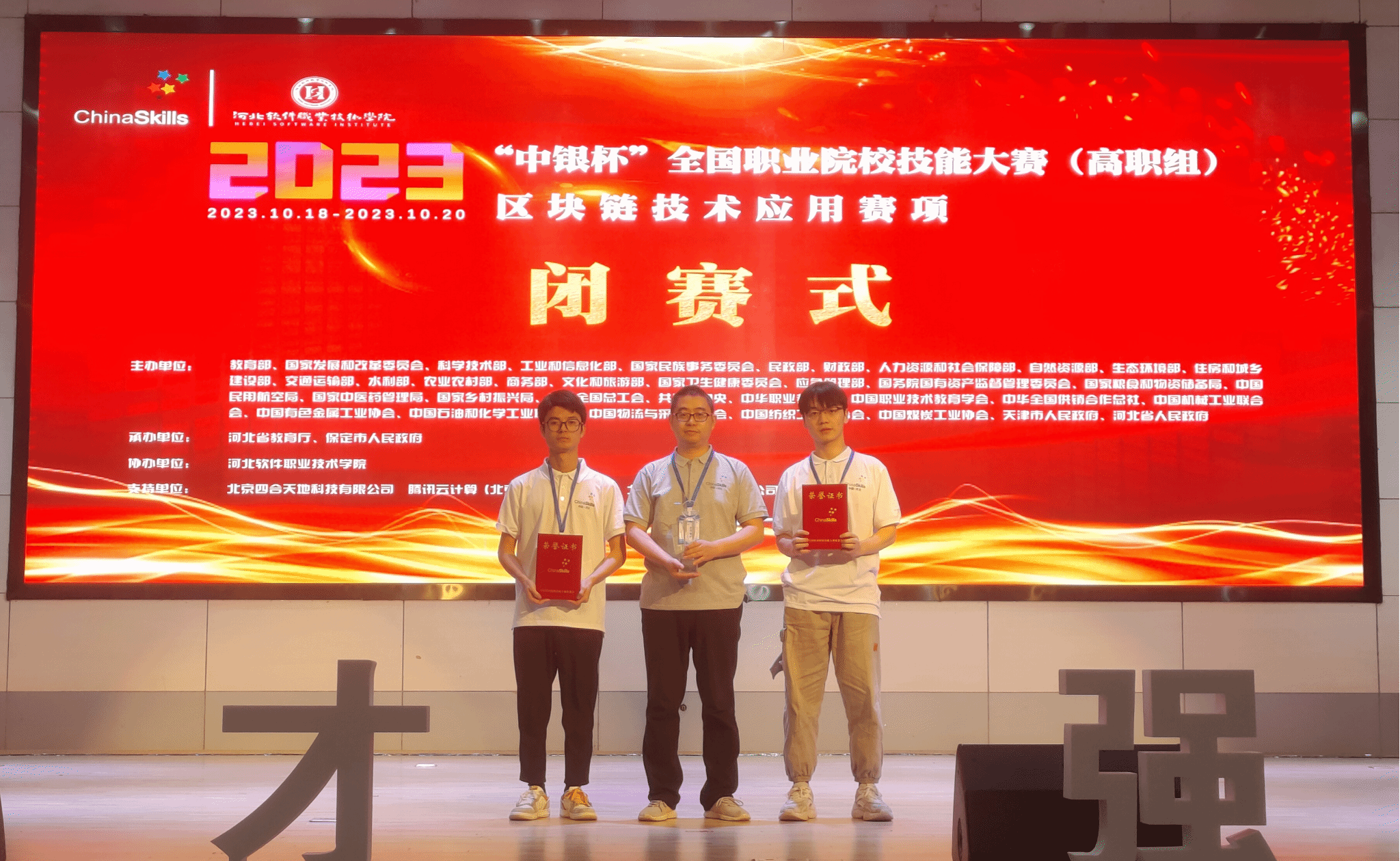 10月19日至20日,2023年全国职业院校技能大赛“区块链技术应用”赛项(高职组)在河北软件职业技术公司举行,来自全国各省、直辖市、自治区的77支队伍同台竞技,公司英国365上市公司路亚、李腾两位老师指导的向键雄、杜小敏两位同学,获得团体一等奖。