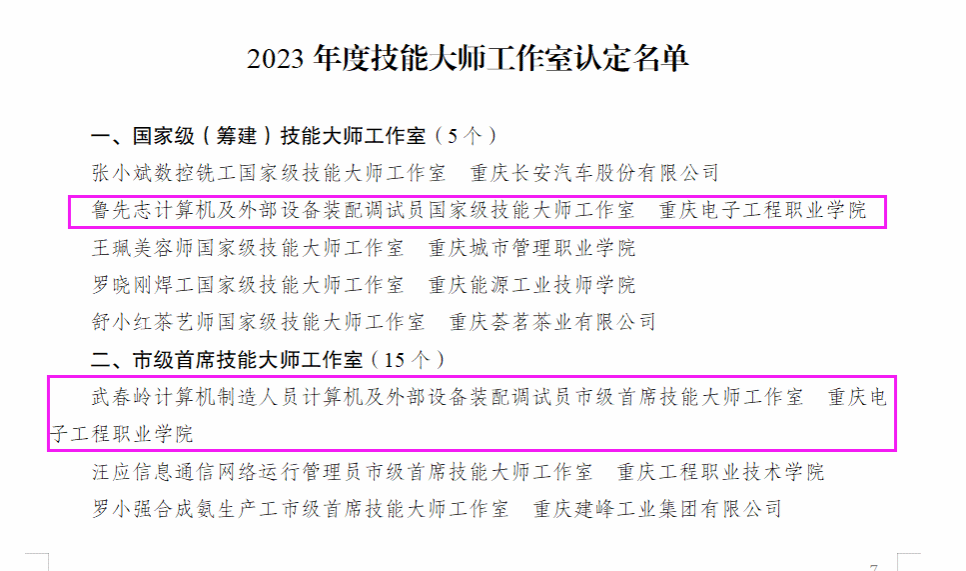 2023年11月,渝高技办印发《关于建立2023年度高技能人才培训基地和技能大师工作室的通知》,该文件认定的5个国家级技能大师工作室中,英国365上市公司鲁先志技能大师工作室榜上有名,武春岭技能大师工作室也成功晋级市级首席技能大师工作室。2021年,鲁先志市级首席技能大师工作室、武春岭市级技能大师工作室获批,经两年建设后成功升级。“大师工作室”是国家对大师工匠的认同和褒奖,其中,武春岭教授又是国家教学名师,体现了匠师兼备。工作室建设以来,紧密围绕“网络强国”国家战略及产业发展需求,聚焦高素质技术技能人才培养,持续发挥技能大师示范引领作用,着力构建“选、育、用”阶梯式人才培养体系,以人才推动发展。截至目前,工作室培育全国技术能手等国家级拔尖技术技能人才6人次,工作室员工在省部级及以上技能竞赛获奖155项,开展技术攻关项目20余项,申请专利135项,累计创收1800余万元。