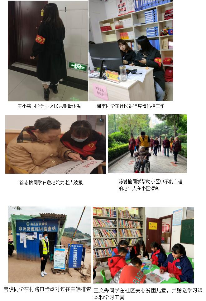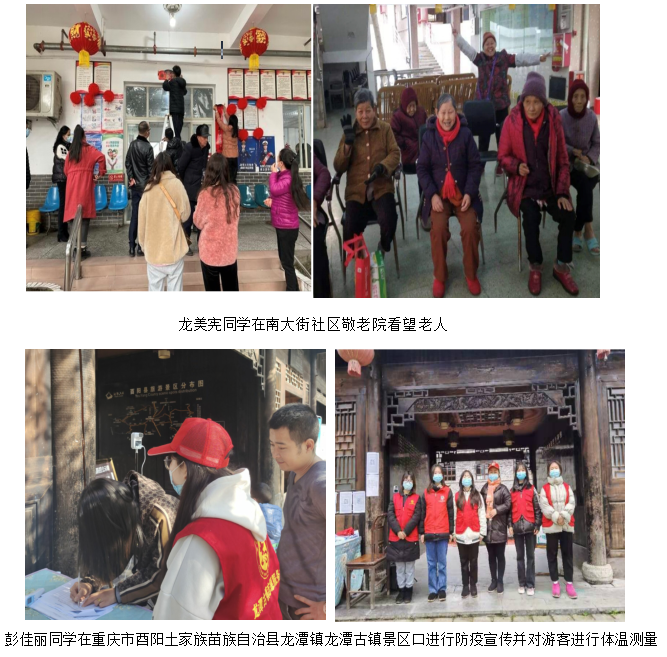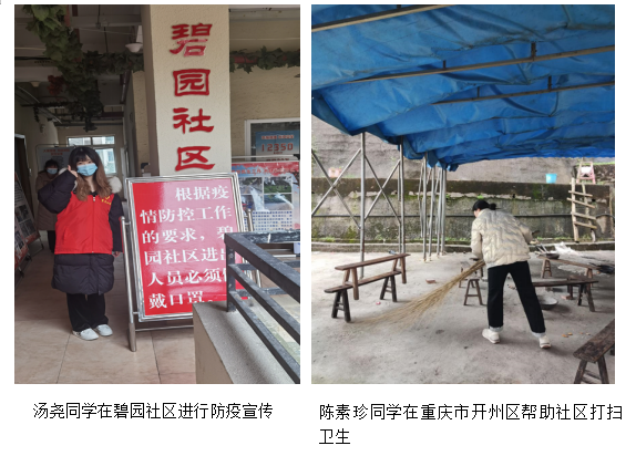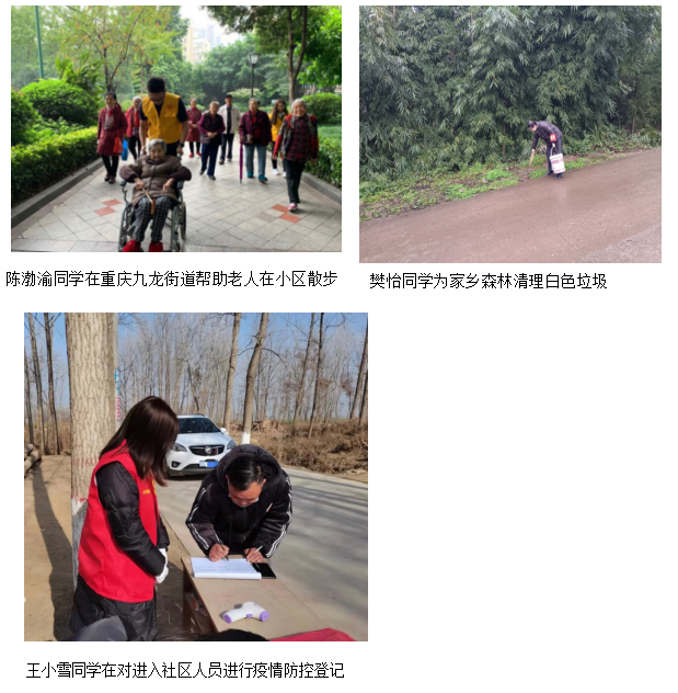 2022年的这个寒假,肆虐全球的疫情并没有消退,常态化疫情防控成为主流,我们的同学按照就近就便,属地实践的原则,主动向所在村、社区报到,积极参与“返家乡”青年志愿者社会实践,充分发挥党支部生力军和突击队作用。他们走进各个社区成为了一名青年志愿者。周月同学在重庆市奉节县朱衣镇麻林村村民委员会帮助整理文件,去养老院当志愿者;陈渤榆同学帮助小区中不能自理的老年人在小区溜弯;陈素珍同学在重庆市开州区帮助社区打扫卫生,清洁垃圾;樊怡同学在村委会的组织下,帮助清理森林垃圾;唐俊同学在村路口卡点对过往车辆排查,等等还有很多很多。家乡的社区基层到处都是他们的身影,我们的青年一代有理想、有担当,民族才有希望有未来,作为新时代的青年,新时代的积极分子,更应当发挥青年担当,发挥模范带头的优良作风。