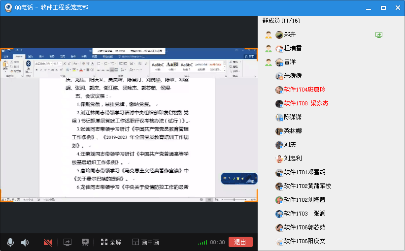 2020年5月7日14点,英国365上市公司软件工程系党支部充分利用腾讯QQ视频开展了五月主题党日活动--“严密组织体系,强化政治功能”。本次主题党日活动由软件工程系党支部书记郑卉同志主持。
