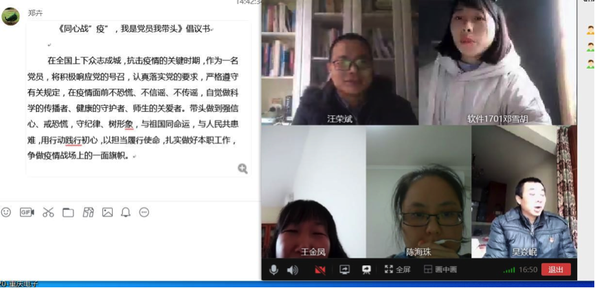 紧接着,支部全体党员重温入党誓词,并宣读《同心战“疫”,我是党员我带头》倡议书,郑卉同志谈到支部全体党员应该行动起来,从我做起,增强自我防护意识,提高自我防护能力,以必胜的信心和顽强的斗志,保持定力、履职尽责、扎实工作,为打赢这场疫情防控阻击战作出应有贡献。