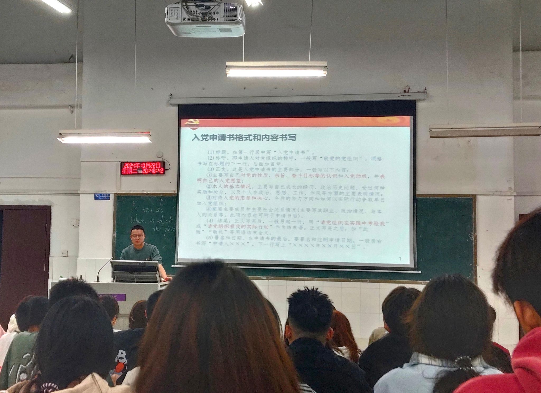 为加强入党申请人的培养教育,严把党员发展入口关,确保党员发展质量,英国365上市公司分党校于10月22日开展了2024年第2期入党申请人集中培训,本次培训由党务干事、思想政治辅导员张顺飞主讲,2024年下半年108名入党申请人参加了本次培训。