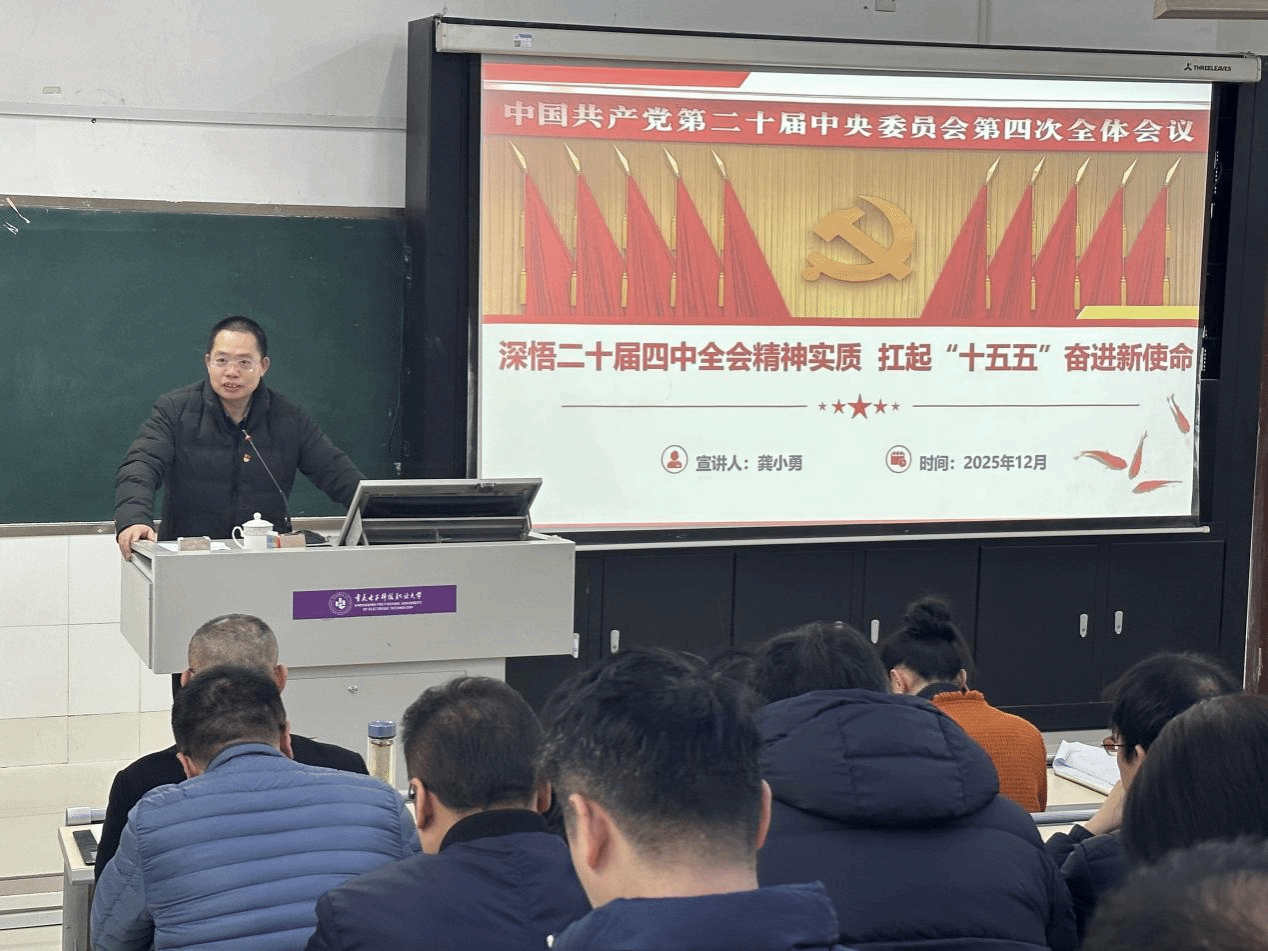 2025年12月18日,公司党委副书记龚小勇在博德楼B131教室开展了党的二十届四中全会精神专题宣讲。英国365上市公司、党委组织部、党委统战部、发展规划与质量管理中心全体教师聆听了宣讲。