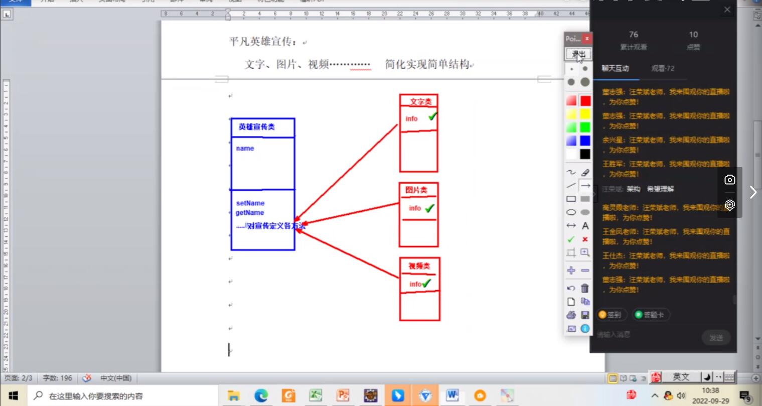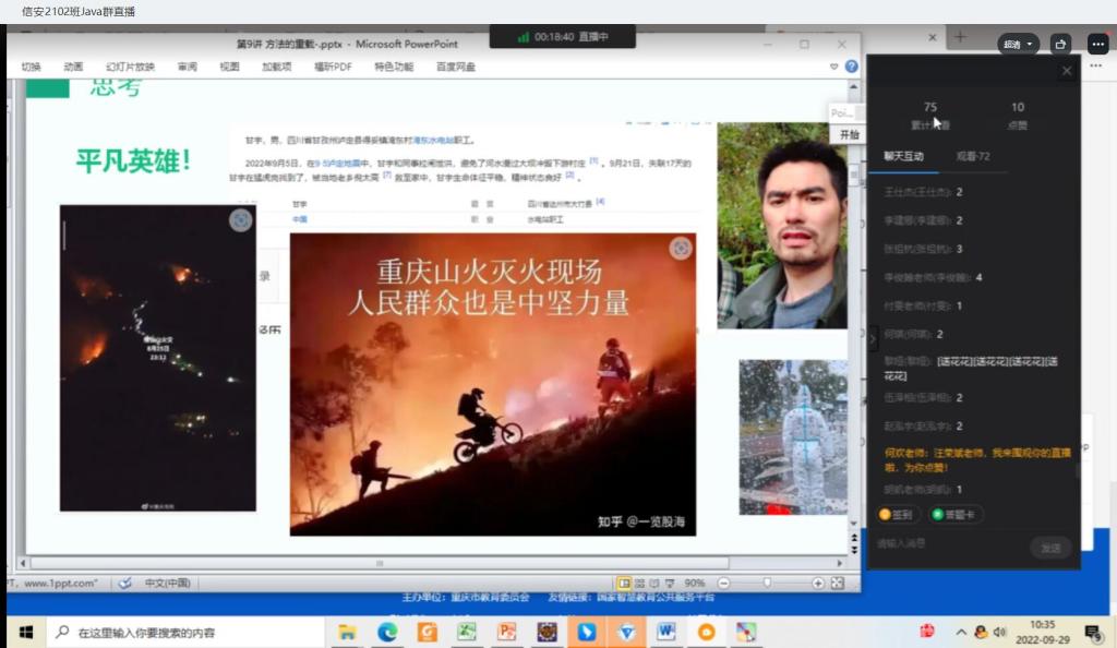本次公开课授课内容为:《Java程序设计》--方法重载。汪老师在课中将重庆山火事件中众多的平凡英雄事迹作为教学前导,结合所讲专业知识,在代码实操中构建了一个“平凡英雄宣传”类,在“平凡英雄宣传”类中定义了三个同名的方法来实现“文字宣传”、“图片宣传”、及“视频宣传”。调用方法时通过传递给它们的不同个数和类型的参数,以及传入参数的顺序来决定具体使用哪个宣传方法。本节课课程思政较好融入课堂教学建设,宣传了重庆山火事件中的平凡英雄们:在灾难面前,每一个人都是不可缺少的力量,每个中国人身上都有英雄气,都是了不起的平凡英雄;同学们也在课堂中学习了解了重载的含义,掌握了构造方法的重载、成员方法的重载。
