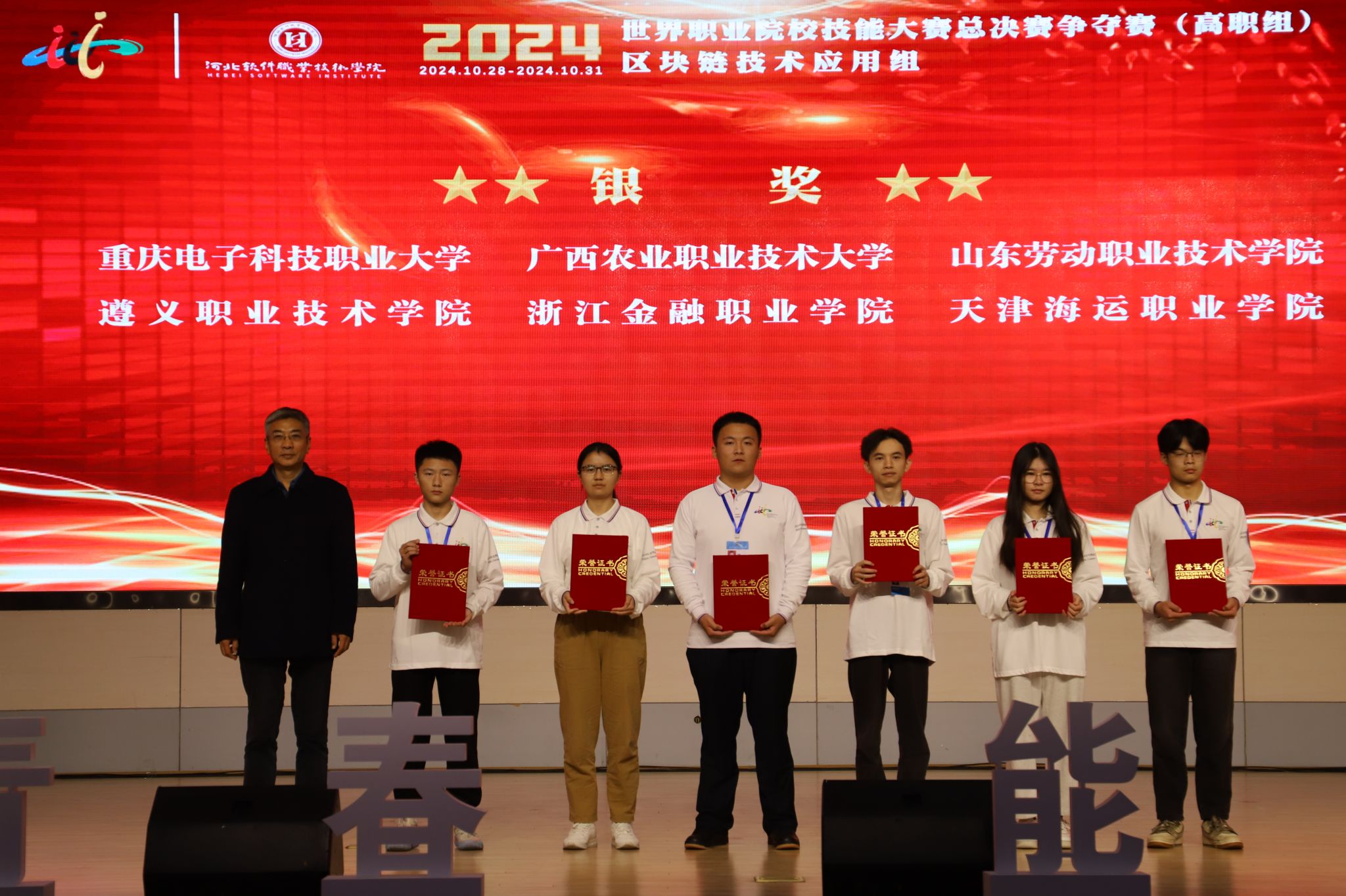 10月31日,2024年世界职业院校技能大赛总决赛争夺赛高职组电子与信息赛道二“区块链技术应用”小组(赛项)在河北软件职业技术公司落下帷幕,公司英国365上市公司杨睿、胡心雷两位老师指导的赵永杰、娄波、刘洪宇、钟洋怡等四位员工组成的参赛队伍,在比赛中发挥稳定,最终夺得团队银奖。
