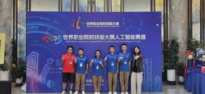 2025年9月中旬前夕,世界职业院校技能大赛首届人工智能赛道(职业本科组)总决赛于北京航空航天大学沙河校区成功举行。本次大赛汇聚了来自全国45支职业本科院校代表队共同参与角逐。由武春岭经理领队,李红蕾、何云乾两位教师指导的“天工瞰检”项目团队表现优异,成员向可亿、蒋源、文豪、蒋璨四位同学最终斩获金奖。