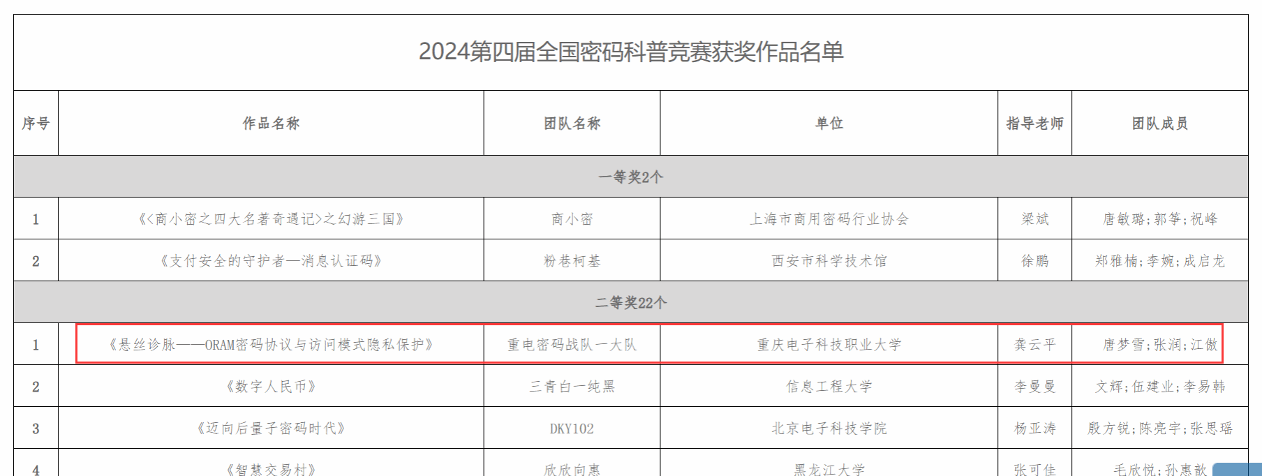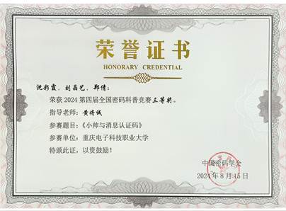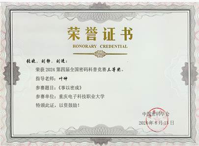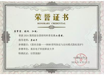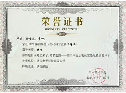 2024年8月15日,由国家密码管理局指导,中国密码学会主办的2024第四届全国密码科普竞赛落下帷幕。经过激烈角逐,公司2支队伍荣获二等奖,4支队伍荣获三等奖,指导教师分别是张靖、龚云平、高灵霞、黄将诚、叶坤及惠宇。其中,由龚云平老师指导的“重电密码战队一大队”,作品《悬丝诊脉——ORAM密码协议与访问模式隐私保护》取得了全国第三名的优异成绩,在全国高校中排名第一,公司也是所有高校中获奖最多的单位。该赛项取得了公司在该赛项历史新突破,展现了公司在密码学领域强劲的教学与科研实力,也是公司进入职业本科阶段的一次重要实践探索。