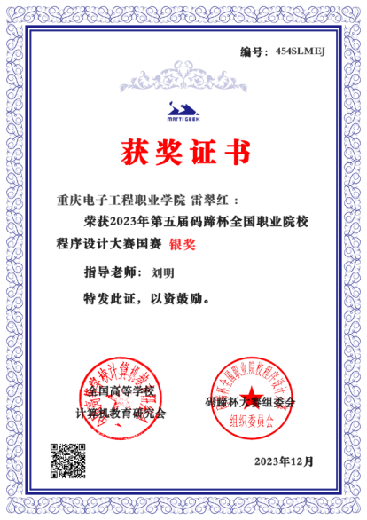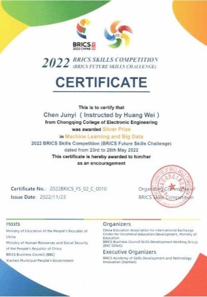 图1 码蹄杯全国职业院校程序设计大赛国赛银奖 图2 金砖国家职业技能大赛机器学习与大数据赛项国际银奖