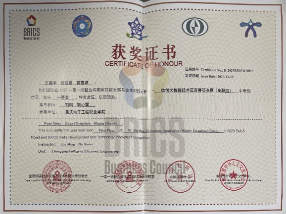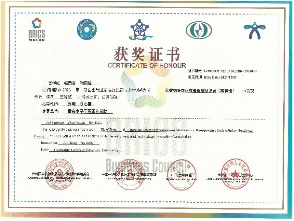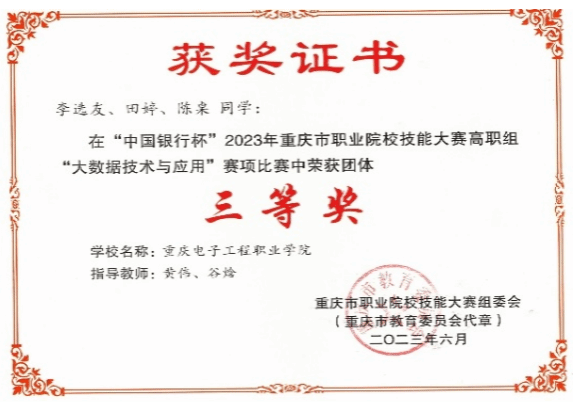 图5 一带一路金砖国家技能发展与技术创新大赛大数据集群运维管理赛项三等奖 图6 “中国银行杯”重庆市职业院校技能大赛大数据技术与应用赛项三等奖