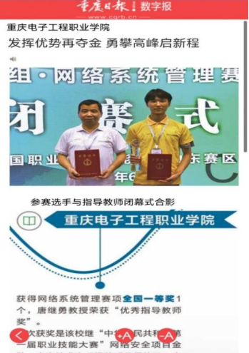 图3 首届世界职业院校技能大赛 信息技术应用创新赛项优胜奖 | 图4重庆日报报道计算机网络技术专业师生 取得的优异成绩 |