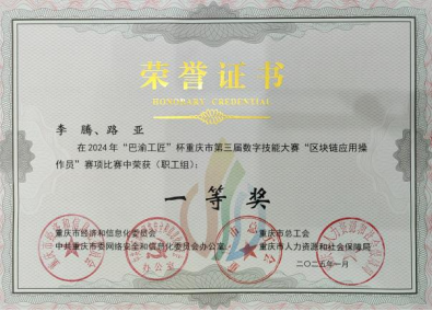 图3 2024年重庆市职业院校技能大赛区块链赛项金奖 | 图4 “巴渝工匠”杯重庆市数字技能竞赛区块链应用赛项一等奖 |
