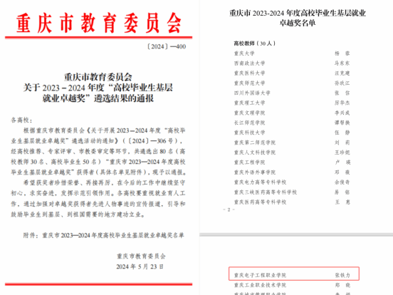 近日,重庆市教育委员会公布了重庆市2023-2024年度“高校毕业生基层就业卓越奖”人选名单,公司公司党总支副书记张铁力荣获重庆市2023-2024年度高校毕业生基层就业卓越奖。